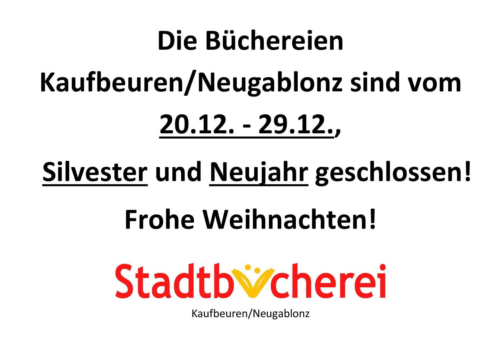 Die Bücherein Kaufbeuren und Neugablonz haben in der Weihnachtswoche vom 20.12. bis einschließlich 29.12., an Silvester und an Neujahr geschlossen!