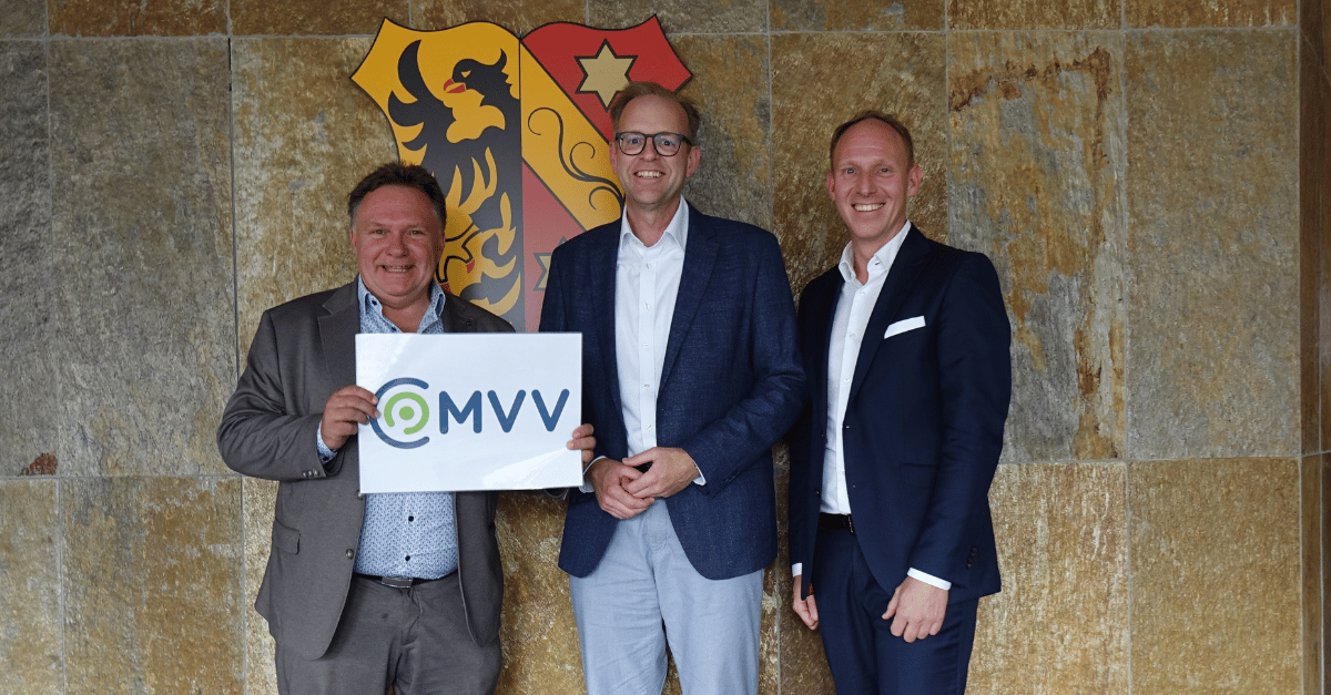 Kaufbeurens Oberbürgermeister Stefan Bosse (links) und Wirtschaftsreferent Andreas Bauer (rechts) begrüßen Dr. Bernd Rosenbusch vom MVV in Kaufbeuren. Foto: Svenja Moller/Stadt Kaufbeuren